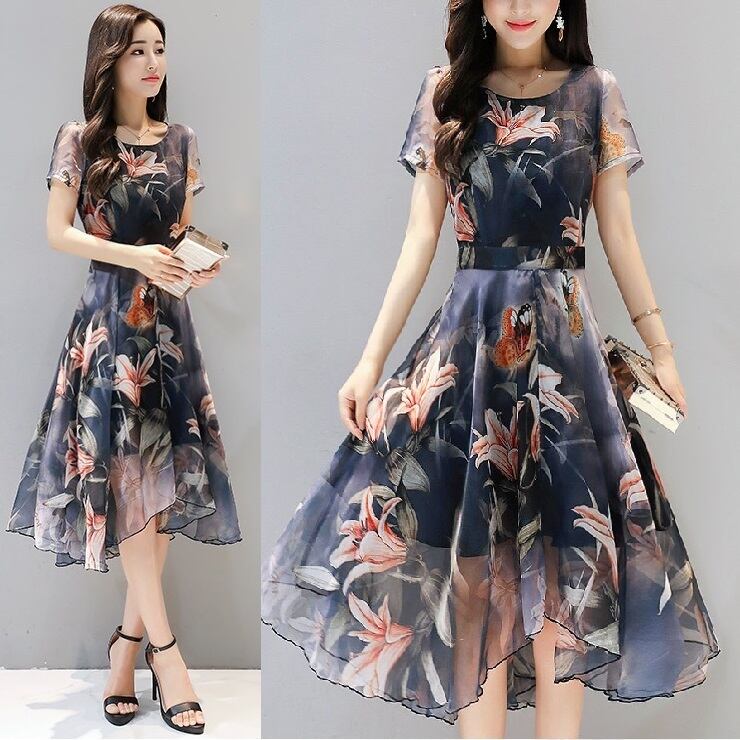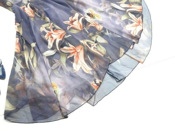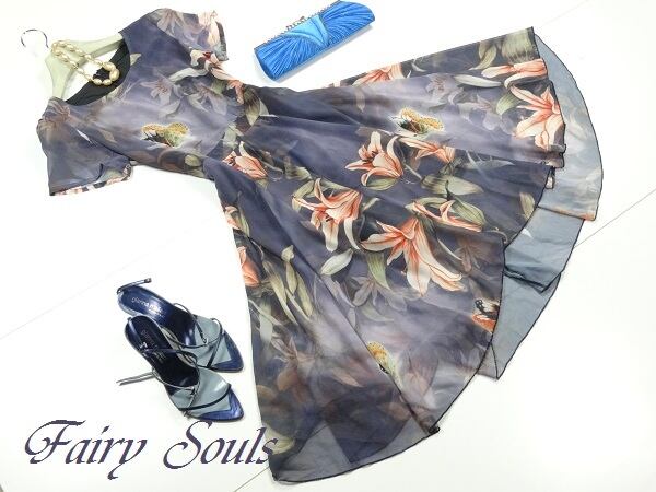 ボタニカル柄半袖の不規則ワンピ-ス。さわやかな紺地に大きなボタニカル柄をプリントした半袖タイプ。ふんわりとしたシフォン地と、ランダムにカットされた裾が風になびきかろやかな印象に。裏地有り。背中ファスナ-有。