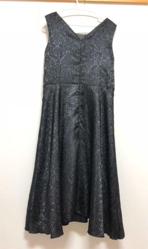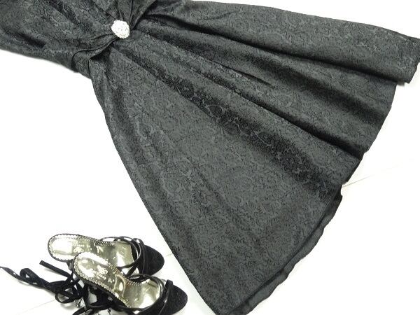 ウエストブローチ付ワンピース。黒の光沢のあるジャガード織がしっかりとした印象の一着。ウエストのブローチは取り外し可能。シックで落ち着いた印象で、フォーマルなシーンにも最適です。胸パッド付。背中ファスナー有。裏地有。