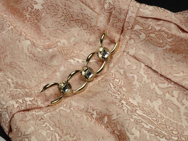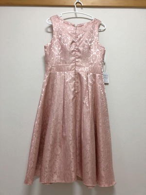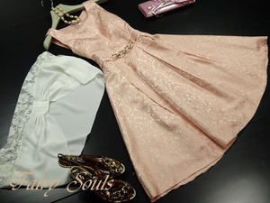 ボレロ付ピンクのワンピ-ス。光沢のあるピンク地に艶のある糸で刺繍を施したような華やかな一着。ウエストにはチェーンとビジュー飾りを施し、白のボレロと合わせればフォーマルなシーンに最適。ボレロ付。胸パッド付。背中ファスナーあり。裏地付き。