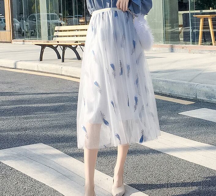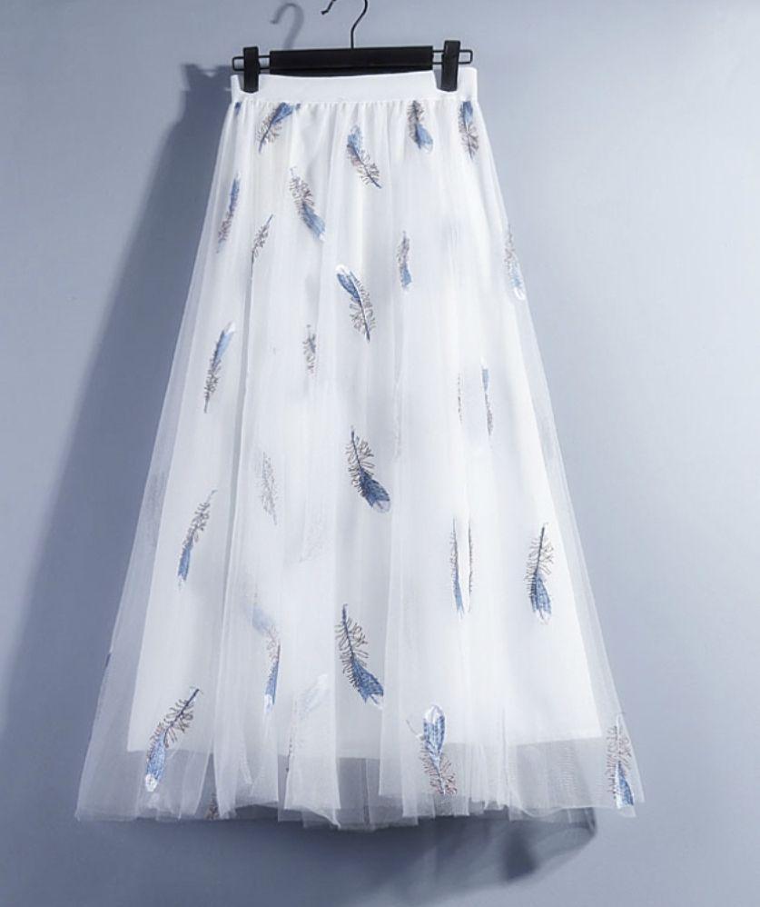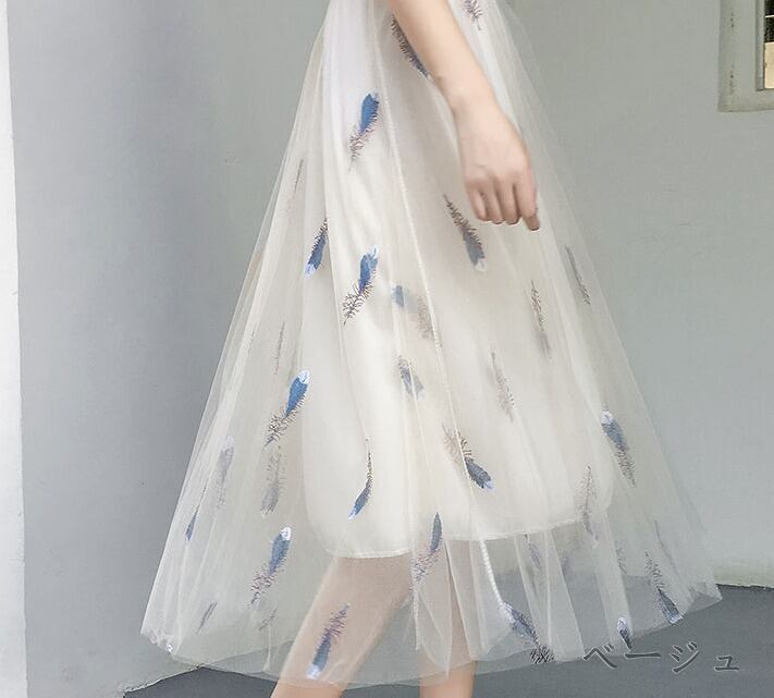 フェザー柄チュールカバーのスカ-ト。白地に青のフェザー柄が刺繍された上に、白のチュールを重ねたフェアリーなデザイン。ウエストは黒のゴム仕様となっており伸縮性があります。リゾートコーデにも最適です!ウエストゴム仕様で伸縮性あり。裏地付。