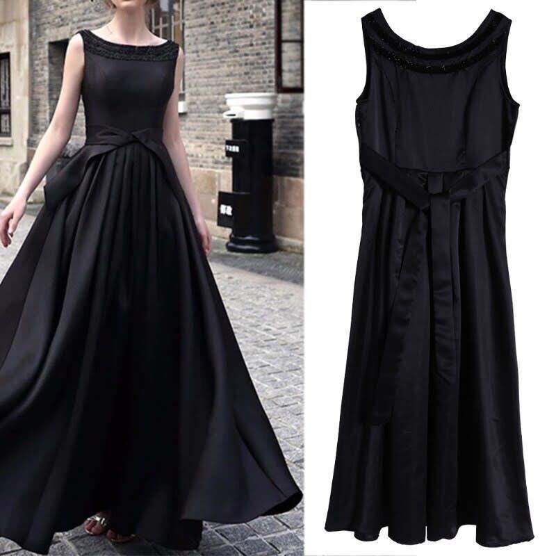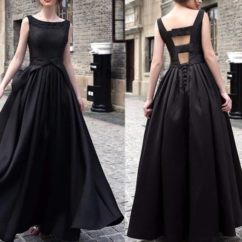 背中開き組紐結びのロングドレス。前身ごろは緩やかな襟元にラメ入バイアスを配し、背中部分は大きく開けてウエストを組紐で結ぶ大人セクシーなデザインに。パーティやイベント、結婚式など、様々なシーンで、気品のある印象を与えてくれる一枚です。裏地なし。右脇ファスナー有。背中組紐結び。