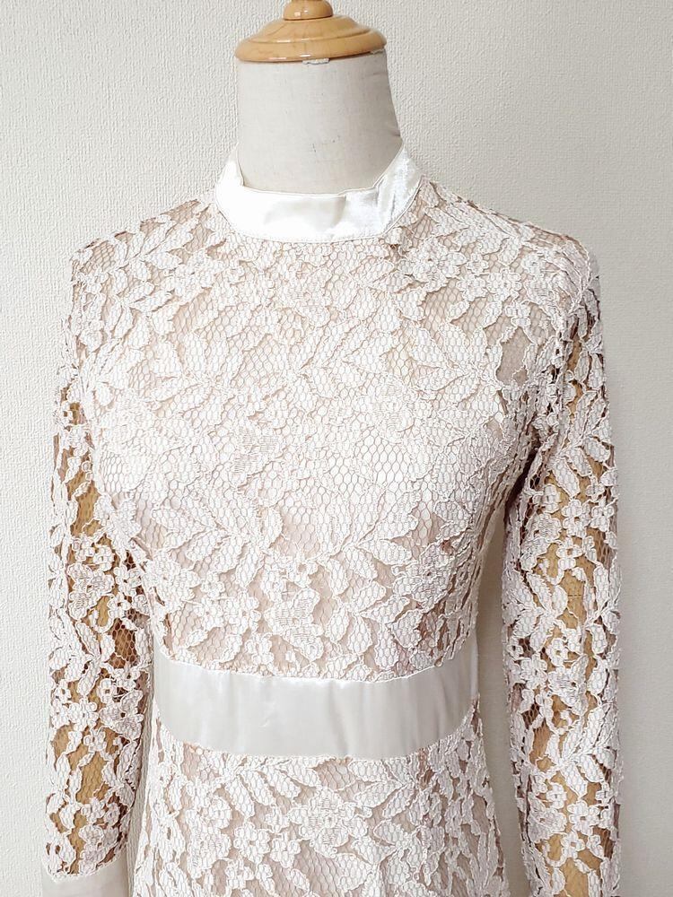 アシンメトリー総レースのワンピース。透け感のある落ち着いたレースのベージュにがシックで、裾は片側だけが長いアシンメトリータイプのユニークで華やかさのあるデザイン。印象的な一着です。背中ファスナー。裏地有。