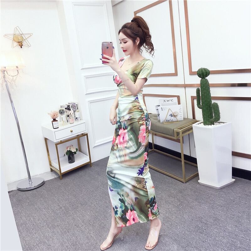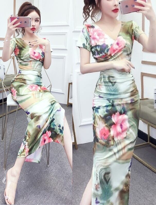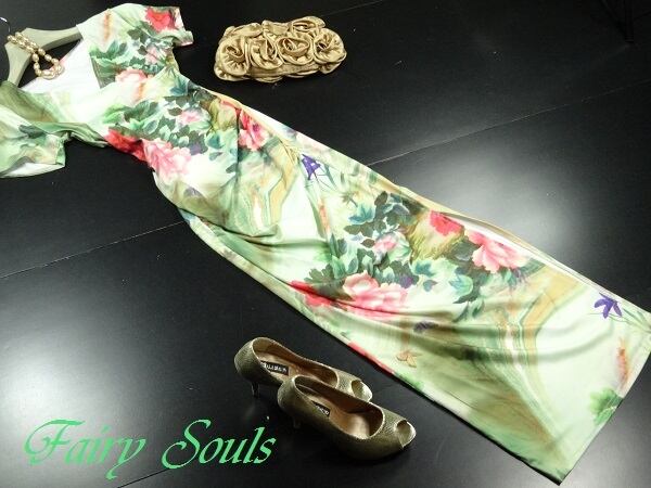 スリット入りセクシーなロングワンピース。爽やかなボタニカル柄の薄手の生地をスレンダーに仕立てた一着。片側の裾に入った約45cmのスリットが大人の女性を演出。パーティやライブ、イベントなどに着る人の魅力を引き出してくれるデザインです。ファスナーなし。裏地なし。