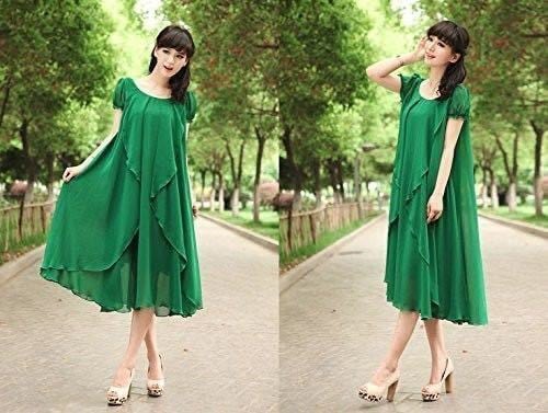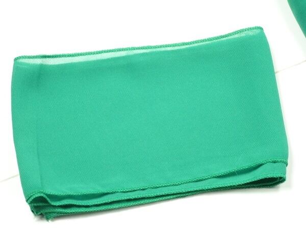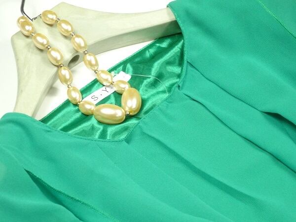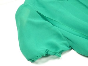パフスリ-ブフレア-ワンピース。鮮やかな緑のシフォン地をふんだんに使用。可愛いパフスリーブにシフォンを重ねたデザインがキュート。ウエストを共布のベルトリボンで絞るとアクセントに。ファスナーなしのかぶるタイプ。裏地有。
