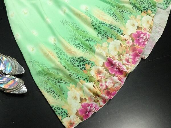 天使のようなとても見栄えのする豪華な花柄シフォンロングドレスです。スカ-ト部分はたっぷりと生地を使い大変ボリュ-ム感のある女性らしい素晴らしいワンピ-スです。軽やかでしなやかな生地で裾が歩くたびにひらひらと揺れ、足元を美しく見せてくれます。裏地有。右サイドファスナ-有。