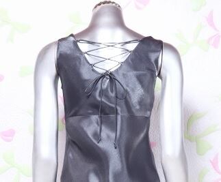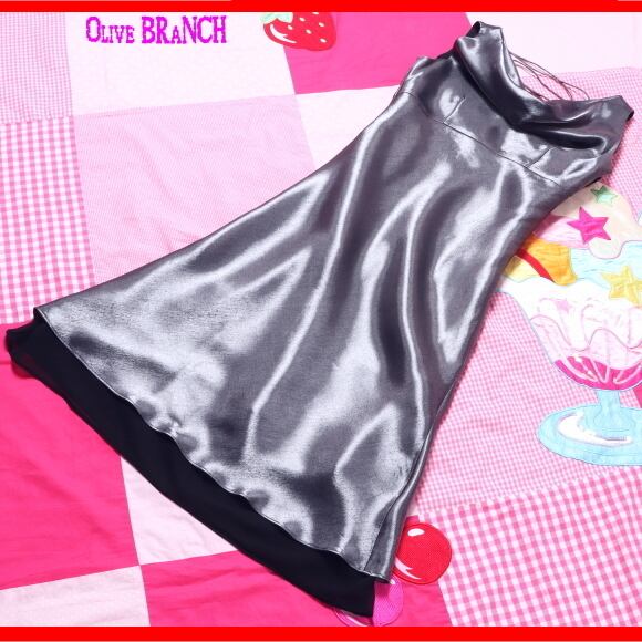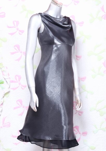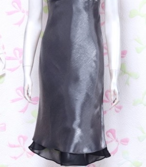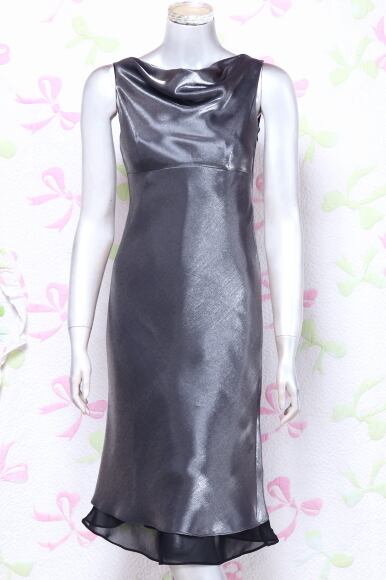 背中紐掛けセクシーなワンピース。生地は艶ややかな濃いシルバーグレーで、裾から黒の生地を見せてアクセントに。大きくVの字に開いた背中は細紐掛けでセクシーでいてキュートな印象に。パーティでは華やかさ抜群の一着です。左脇下ファスナ-有。裏地あり。