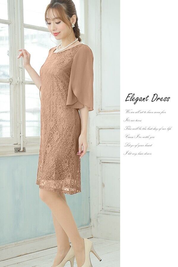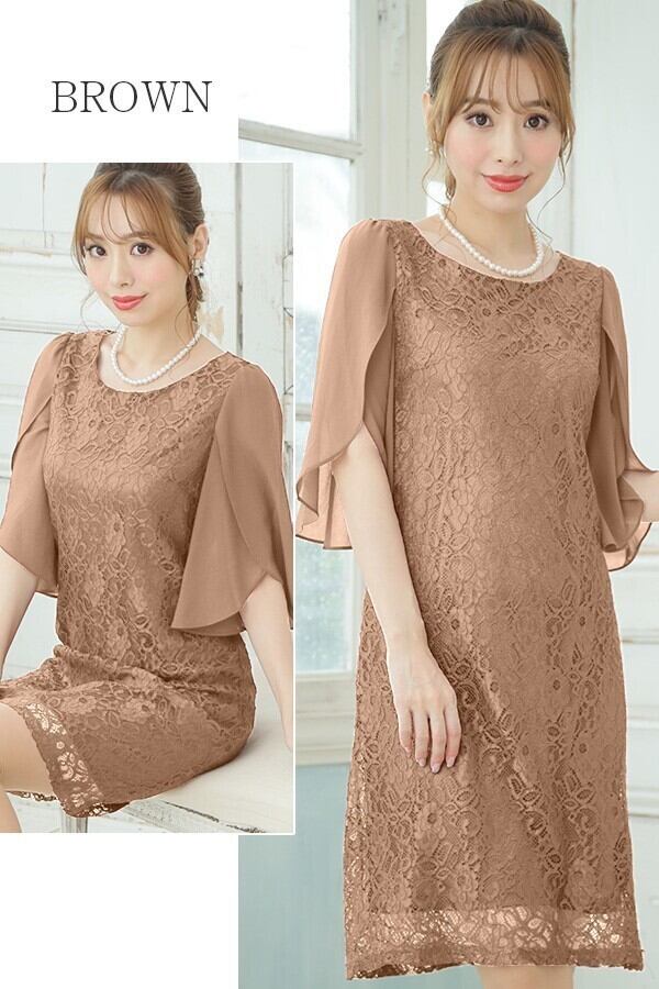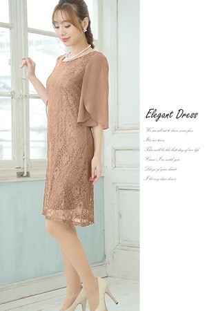 チュ-リップ袖ブラウンゴ-ルドの総レースワンピースです。フレアが綺麗なAラインのシルエット。下地の上に、凝ったデザインの総レースをかぶせたフェミニンなデザインになっていますシックで上品な女性を表現。パーティやイベント、コンサート、結婚式にと、さまざまシーンで活躍してくれる美しい一着。背中ファスナー。裏地付。