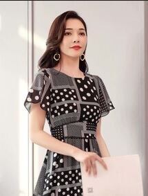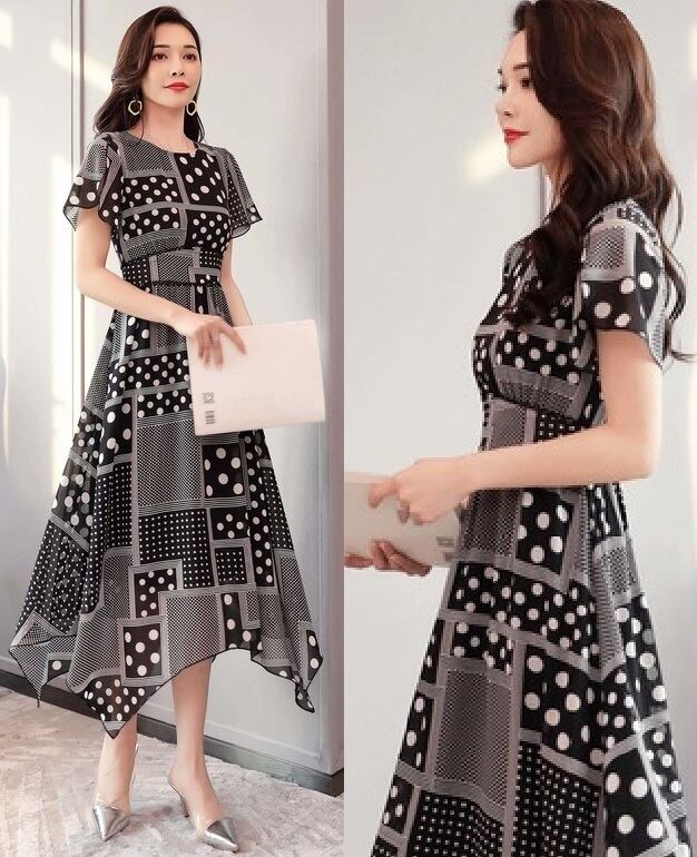 ドット柄シフォンロングワンピ-ス。大小のドット柄と幾何学模様がプリントされた裾がアシンメトリーなデザイン。軽やかでしなやかな生地で裾が歩くたびにひらひらと揺れ、足元を美しく見せてくれます。裏地有。背中ファスナ-有。