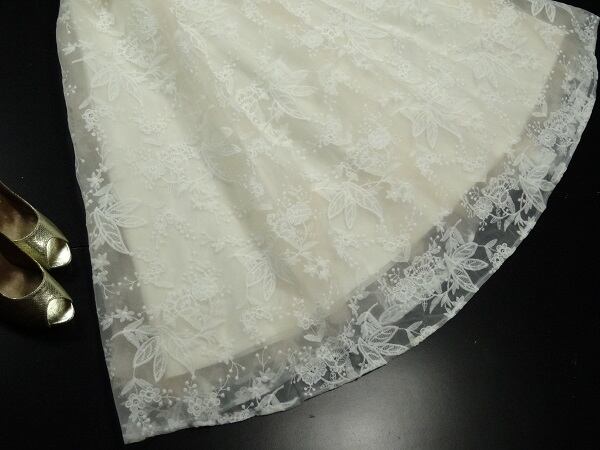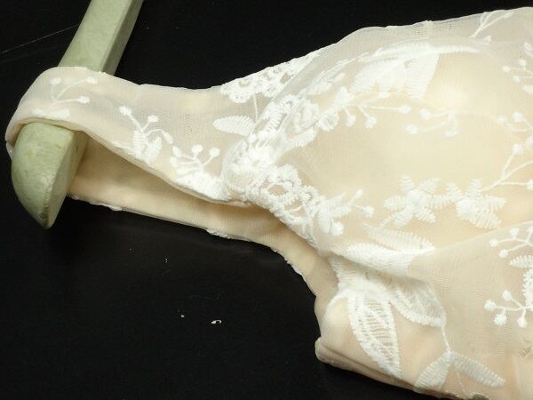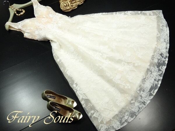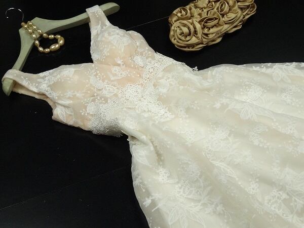 刺繍レースのウェディングドレス。V字カットの胸元はとても美しく、ウエストから裾にかけてのチュールがボリューム感があり優雅で大人の女性を醸し出してくれています。全体に刺繍が施されデザイン性のあるスタイルがとても魅力的で、ウェディングドレスとしても、またパーティドレスとしても活躍してくれる一着です。背中編み紐掛け。腰下ファスナ-有。胸パット付き。裏地なし(ピンクの下地の上に刺繍をほどこしたチュール地を重ねています)。