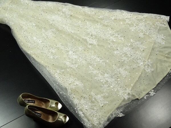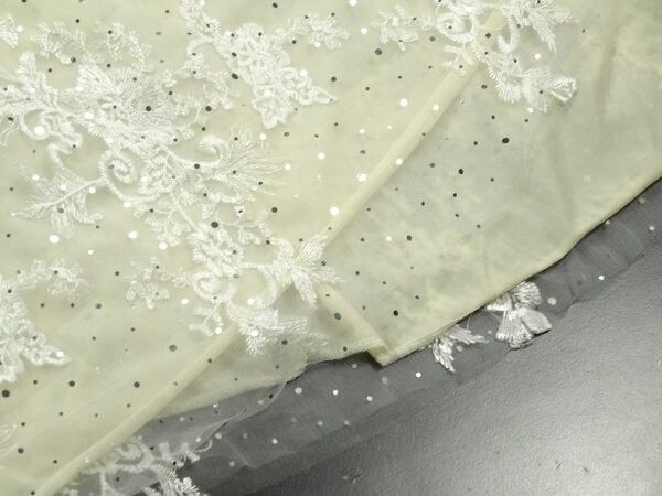 刺繍チュール重ねワンピドレス。淡いオフホワイトのシフォン地の上に、刺繍を施したチュールを重ねた美しい一着。ウエストから裾にかけて生地をたっぷりと使い優雅な印象に。パーティ、コンサート、結婚式の二次会にと、様々なシーンに活躍してくれます。背中ファスナーあり。裏地付き。