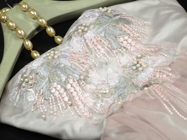 胸元刺繍とパール飾りのカラ-ドレス。胸元は立体刺繍にパ-ル飾りが施され、ウエストからスカート裾まではしなやかなチュールを重ねとても豪華。下地はグレー。上地のチュールはピンクで画像よりもグレーの色合いが強いかと思います。パーティやライブ、イベント、結婚式など、どんなシーンでも活躍してくれる一着です。裏地有。背中編み紐掛け。腰下ファスナー有。胸パット付き。