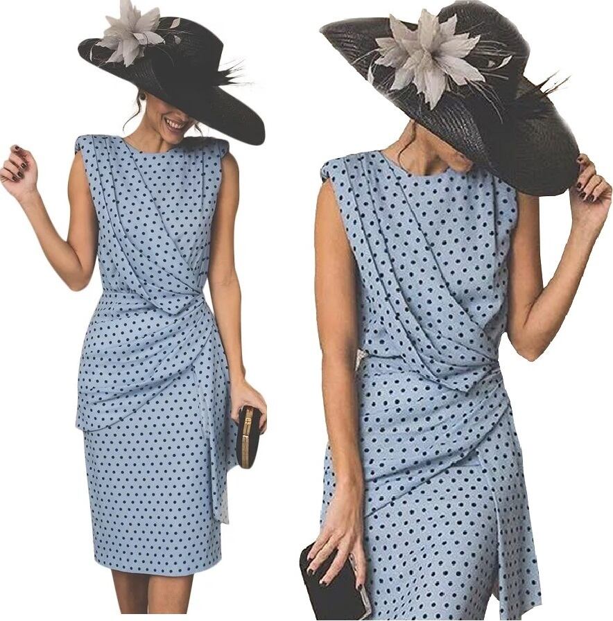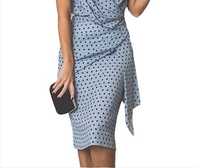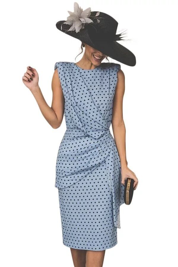 大人の魅力ドット柄のワンピース。黒のドット柄がプリントされたしなやかな水色の生地を胸元でドレープ仕立てにした大人の魅力が詰まったデザイン。パーティや結婚式に。裏地なしで軽やか。透け感はありませんが、気になる方はインナー着用をおすすめします。背中ボタン留め。腰下ファスナー付。