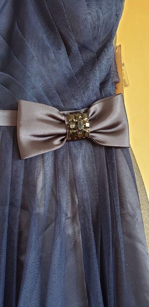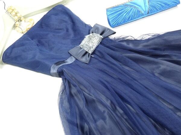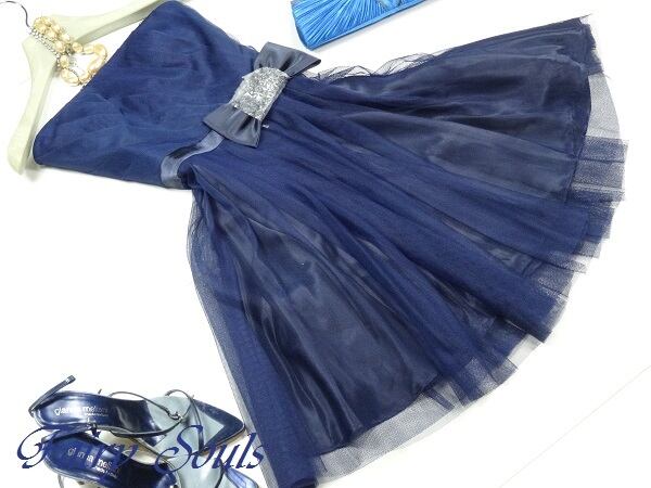 ネットチュールのパーティ-ドレス。胸元は斜めにタックをとり、ウエストのサテンのリボンがアクセントに。(リボンは画像では保護のためエアキャップをつけています)背中の編み上げ紐でサイズ調整も可能。ベアタイプとしても、また胸元中央にチェーン飾りが付いていて、首の後ろに回しホールドネックとしても着用いただけます。(ゴールドのネックレスは付属なし)裏地あり。背中網掛け。左脇ファスナー。胸パット付き。