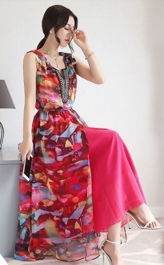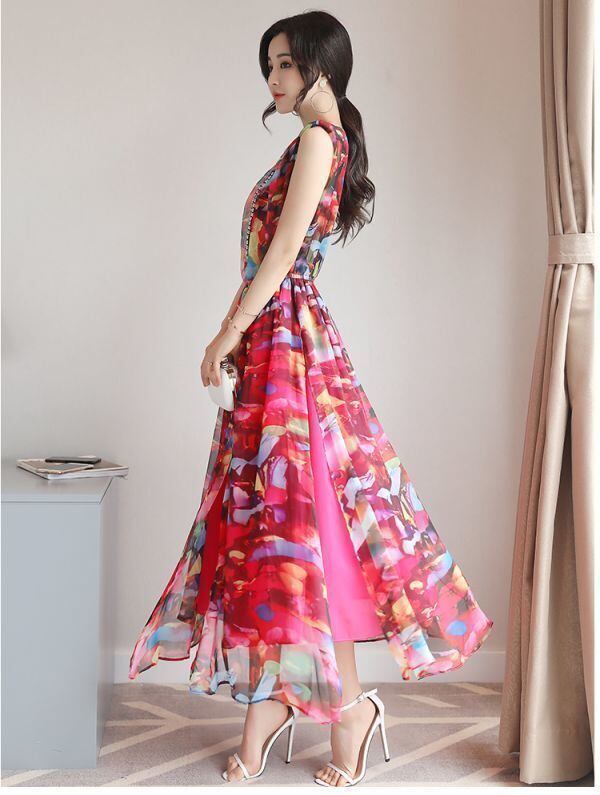 襟元くるみボタン飾りのロング丈ワンピ-ス。爽やかな赤の生地に鮮やかな色をミックスした羽モチーフの模様をプリント。えり元には共布のクルミボタンを飾りアクセントに。ウエストはゴム仕様で伸縮性あり。華やかでキュートなカジュアルにもフォーマルにも着用いただける魅力的な一着です。裏地有。ファスナ-なし。