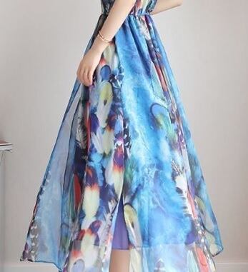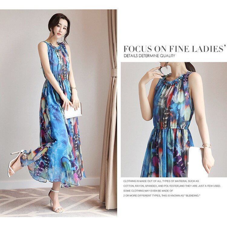 襟元くるみボタン飾りのロング丈ワンピ-ス。爽やかな青の生地に鮮やかな色をミックスした羽モチーフの模様をプリント。えり元には共布のクルミボタンを飾りアクセントに。ウエストはゴム仕様で伸縮性あり。華やかでキュートなカジュアルにもフォーマルにも着用いただける魅力的な一着です。裏地有。ファスナ-なし。
