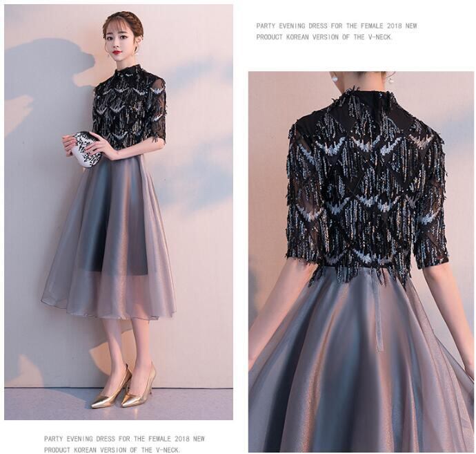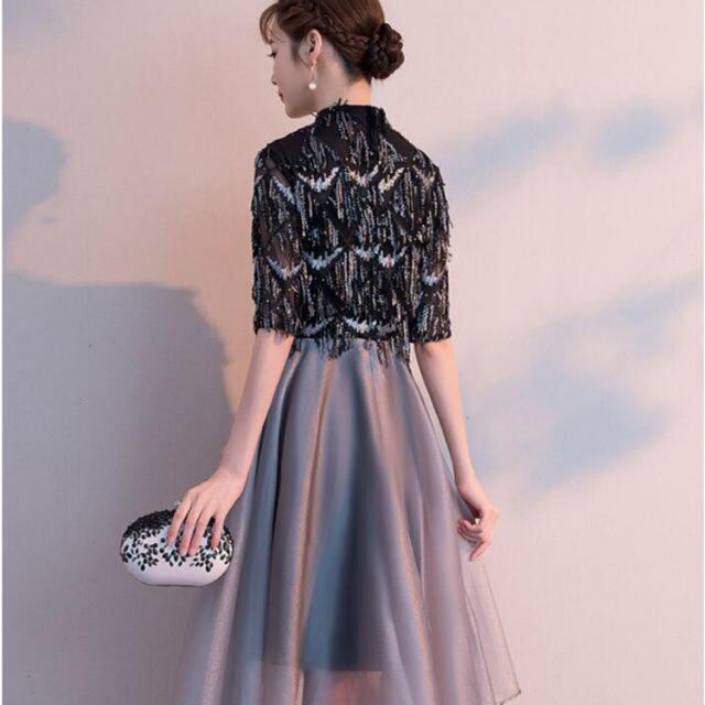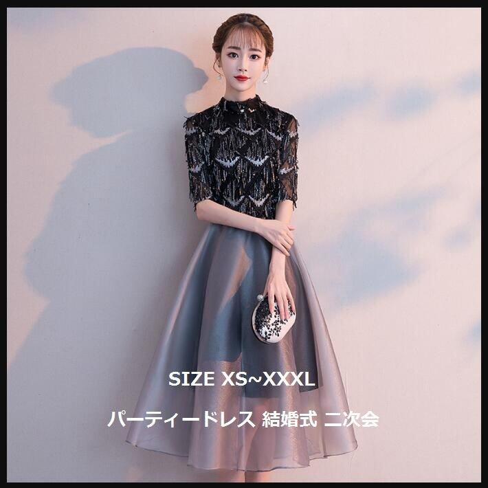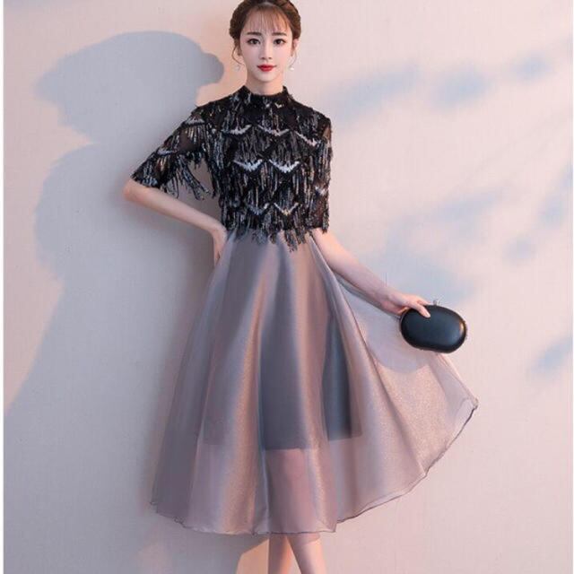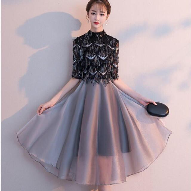 スパンコール飾りとオーガンジーのワンピ-ス。トップスは黒のチュール地全体にスパンコールを散らし、スカート部分はシックな濃いグレーのチュールをふんだんに使用した華やかなデザイン。とてもエレガントなワンピ-ス一着です。 裏地有。背中ファスナ-。胸パット付き。
