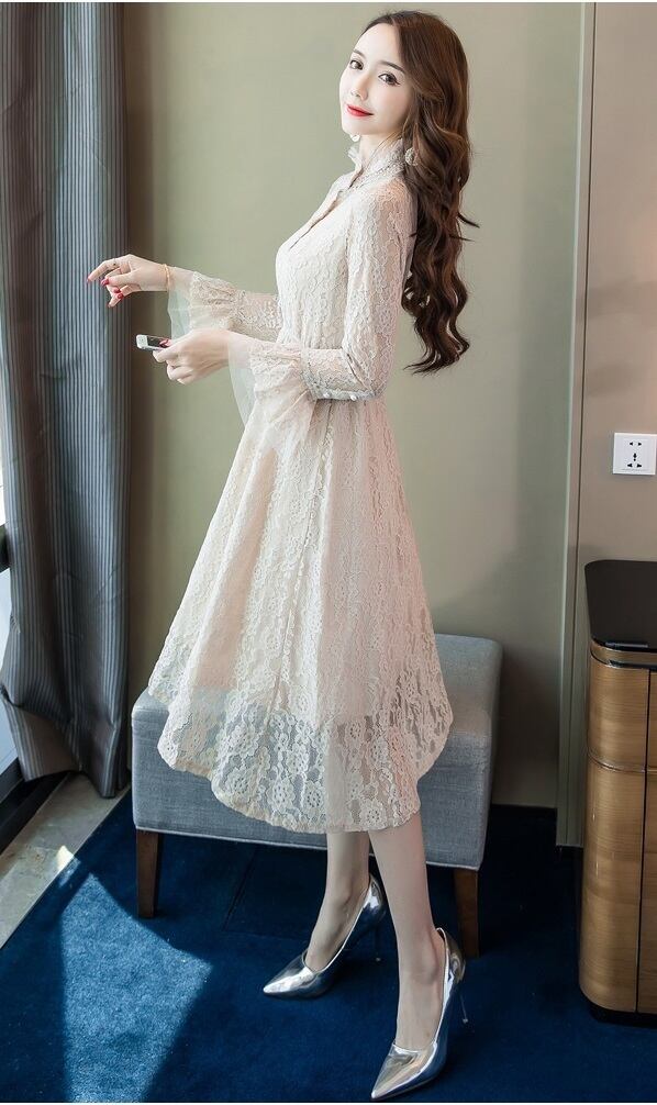 刺繍総レ-スフェミニンなデザインの膝丈ワンピ-スです。スリムに見えるデザインで大人の女性を醸し出してくれる一着です。裏地あり。前ボタン有。