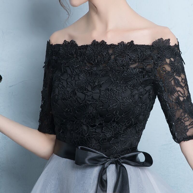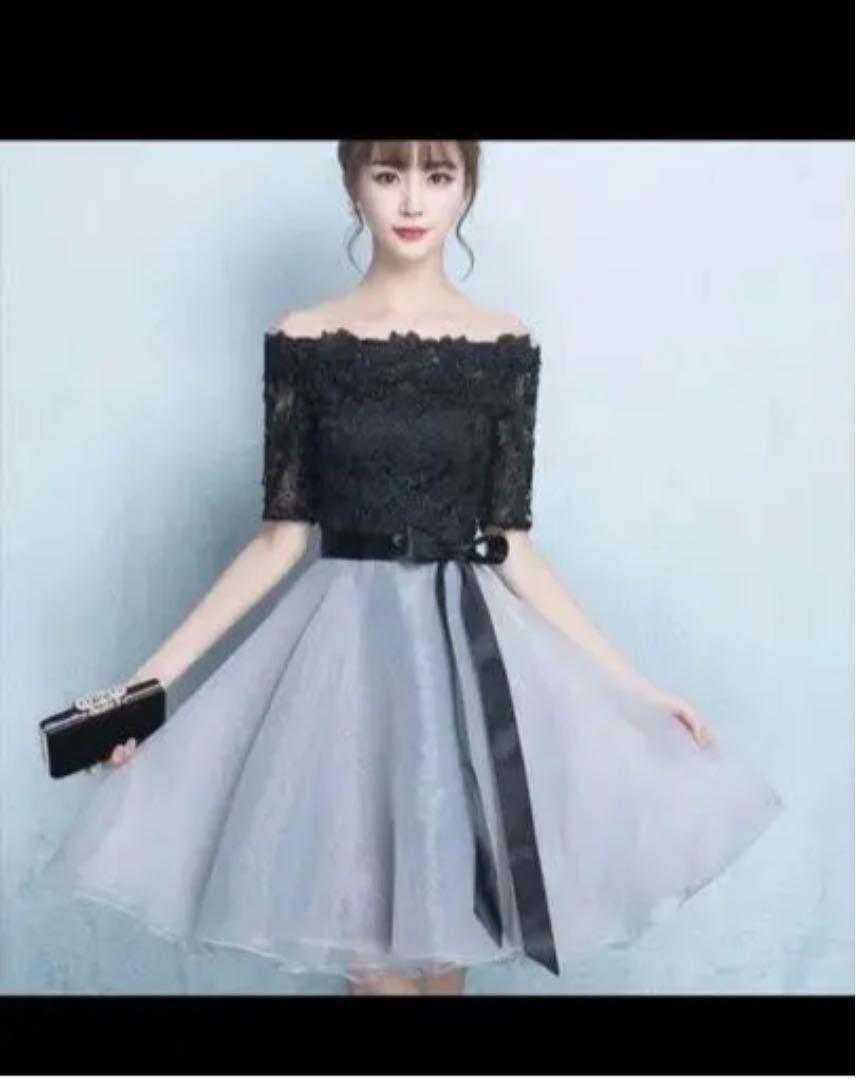 オフショルダーのワンピ-ス。トップス部分は肩のラインが美しく見えるオフショルダーでサテンの黒地に花の刺繍をあしらっています。ウエストから裾までは黒のサテン生地の上に柔らかなオーガンジーを重ね、ピュアでフェアリーな印象に。パーティやイベント、結婚式など、様々なシーンで活躍してくれる一枚です。ウエスト布リボンベルト付き。裏地なし。背中ファスナ-。胸パット有。