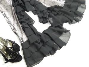 スネーク柄のフィッシュテ-ルドレス。全体にスネーク柄をプリントし、ハイウエストに黒サテン地のリボンをあしらっています。裾は前に向かって丈が短くなっており、シフォンのフリルが動きを美しく見せてくれます。裏地なし。ファスナ-なし。肩紐は調整可能。