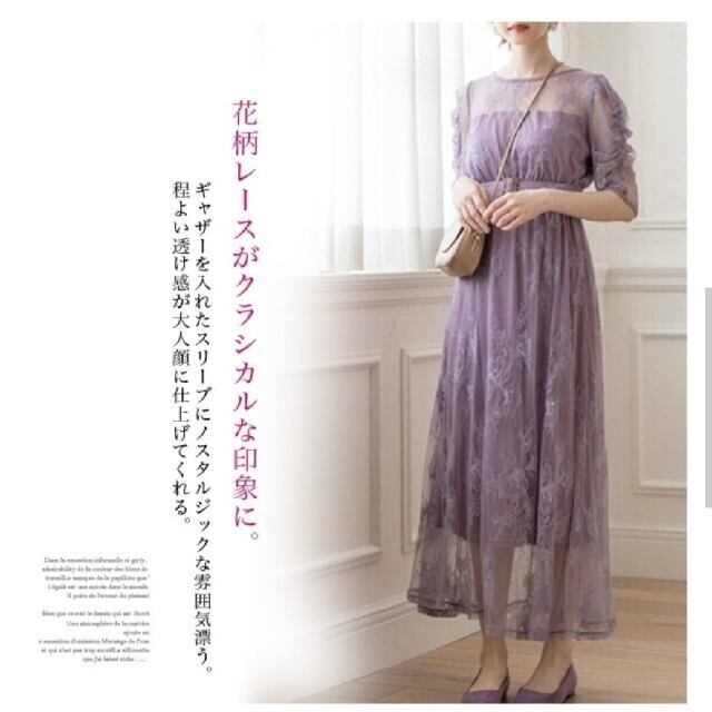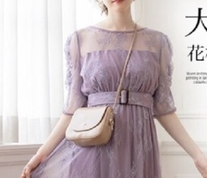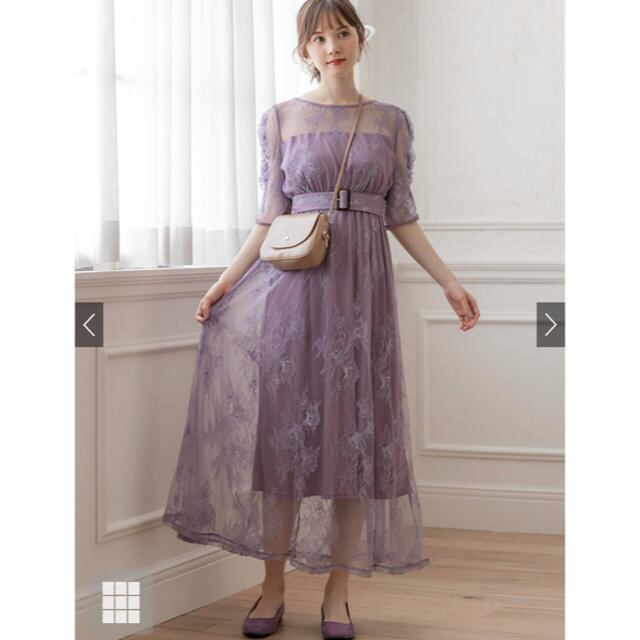 ネットチュールのロングワンピ-ス。少しくすんだラベンダー色のネットチュール全体にほどこされた花柄の刺繍がとてもエレガントで大人の女性を十分に演出してくれる一着です。背中側はボタン一つ留め。ウエストはゴム仕様でサイズ的に余裕をもって着用いただけて、付属のベルトがアクセントに。裏地有。ファスナ-なし。ウエストベルト付き。