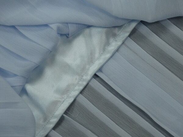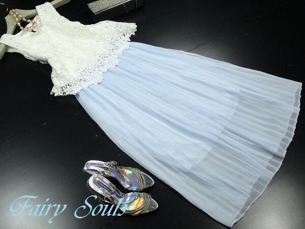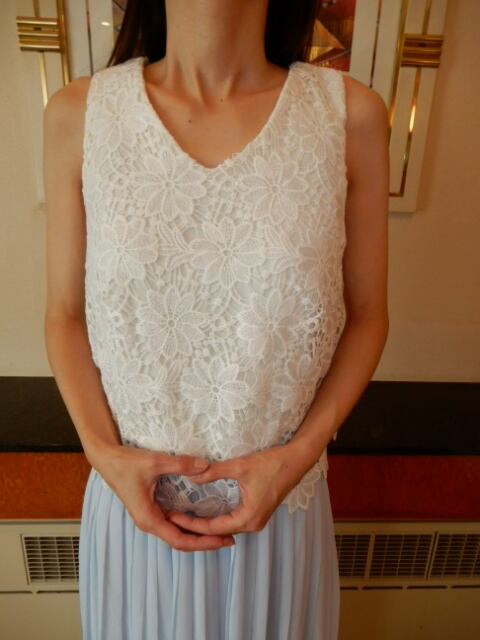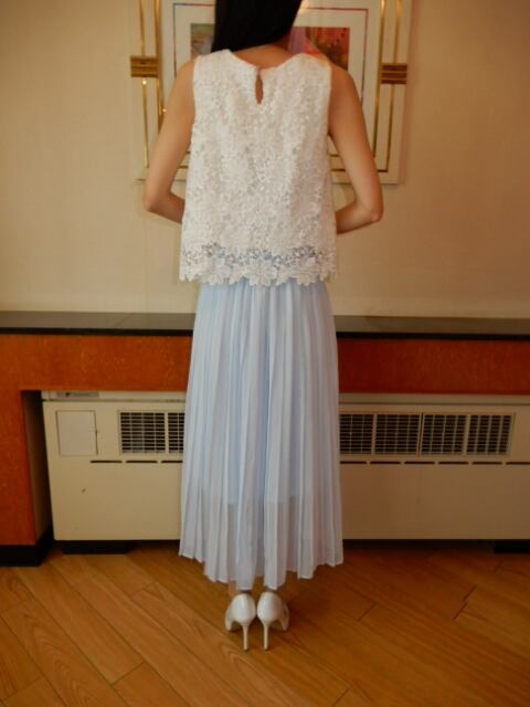 レースとシフォンのロング丈ワンピース。トップス部分は白の下地の上に空きレースを重ね、ウエストから下はさらさらとした水色のシフォン地をたっぷり使用した途中までのゆるやかプリーツ仕様になっています。ウエストはゴム仕様でサイズ調整可能。どんなシーンにも重宝する一着です。裏地有。ファスナーなしのかぶるタイプ。首後ろボタン一つ留め。