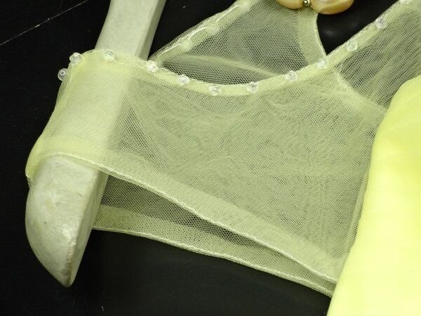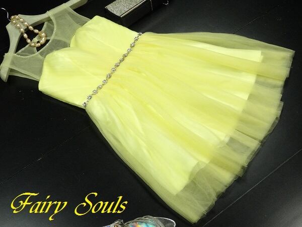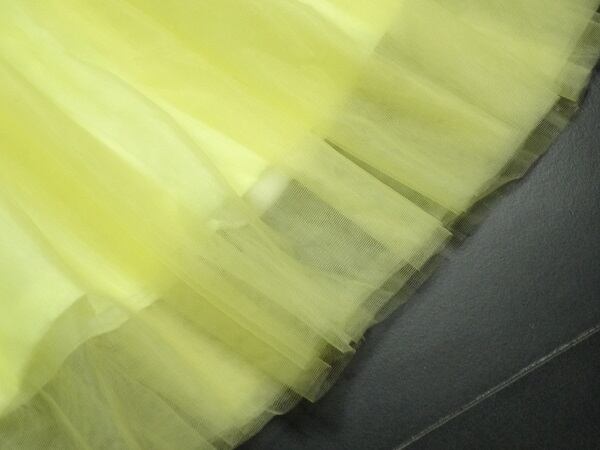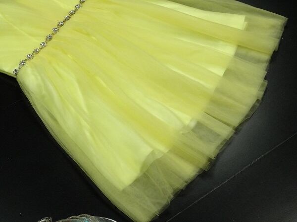 チュールレースミニドレスです。黄色のサテン地に黄色のチュール地が重ねられたフェミニンなデザイン。ウエストにはビジューを配し、背中は編紐掛けでサイズ調整が可能。デコルテラインから肩にかけての透け感が大人の雰囲気を醸し出しています。パーティやイベント、コンサート、結婚式にと、さまざまシーンで活躍してくれる美しい一着。背中編み紐掛け。背中腰から下ファスナー有。裏地なし。(サテン地とチュール地の2枚重ね)胸パット付。