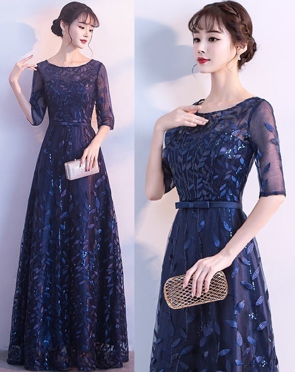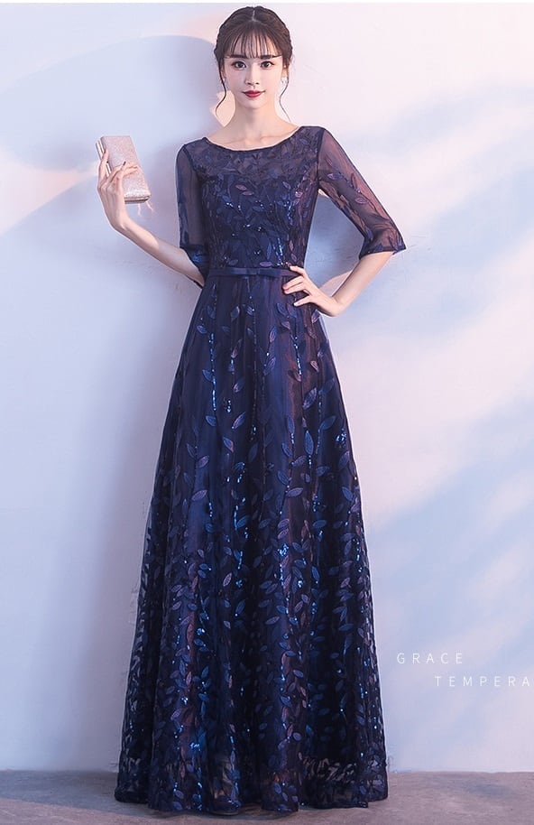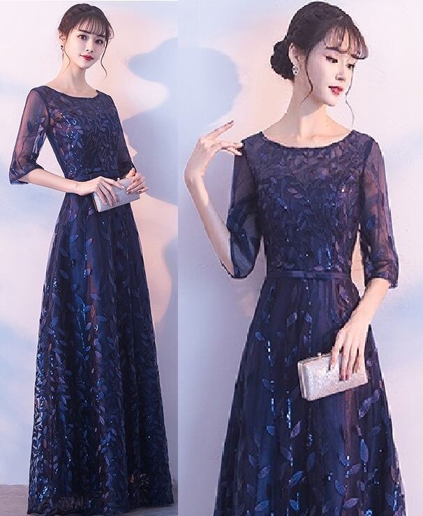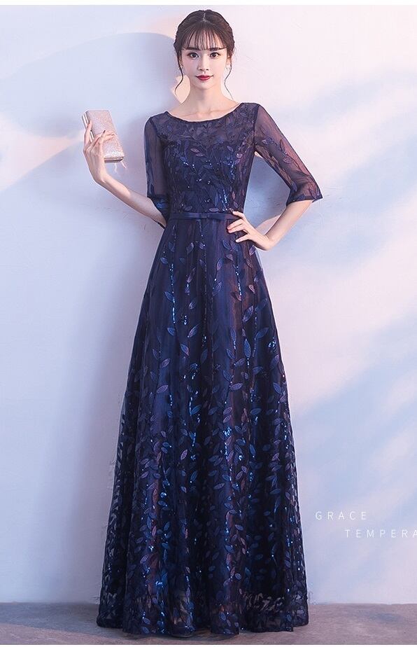 刺繍レースロングドレスです。袖やデコルテの透け感がとても美しく大人の女性を醸し出してくれるエレガントな一着です。サテン地に全体的にネイビ-の刺繍が施されチュ-ルレ-スが重ねられたデザイン性のあるスタイルがとても魅力的です。全体的に優しい感じに仕上げられています。背中ファスナ-有。裏地なし。