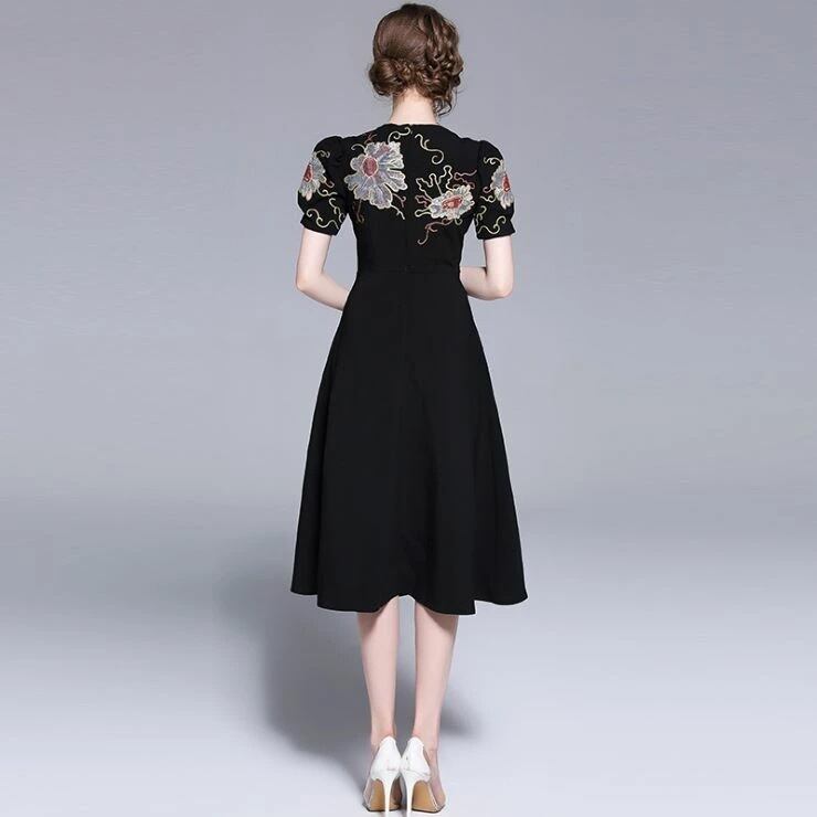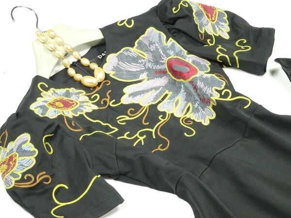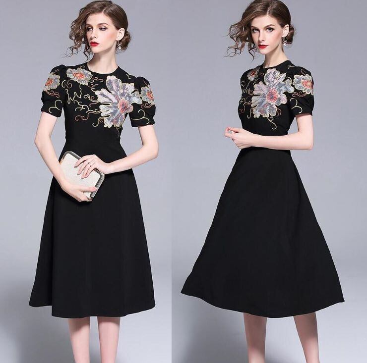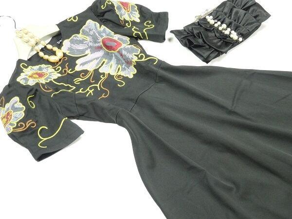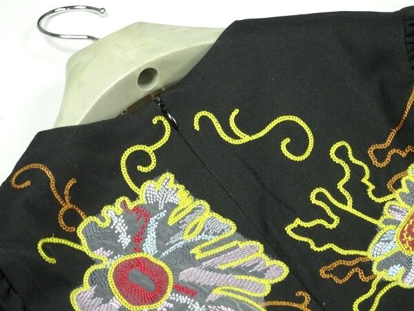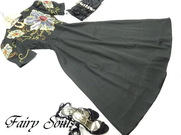 華やかな刺繍のAラインワンピース。シックな黒地にトップス部分と袖に大きな花模様を刺繍した華やかな一枚。ウエストから下は無地なので、華やかさとシックな印象のバランスが良く、上品な仕上がりになっています。どんなシーンにも活躍してくれるエレガントな一着です。背中ファスナーあり。裏地付き。
