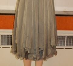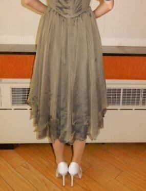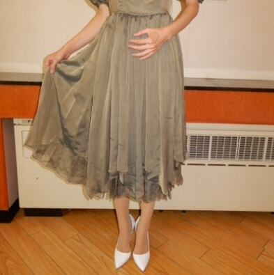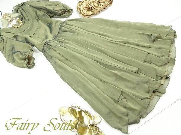パフスリ-ブ胸元ドレ-プフレア-ミモレ丈ドレスです。胸元のドレ-プがエレガントでシフォン地がふんだんに使用されたスカ-ト部分は揺れ感抜群です。デザインがキュートです。背中ファスナー有。裏地有。