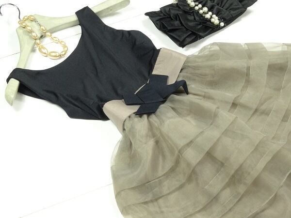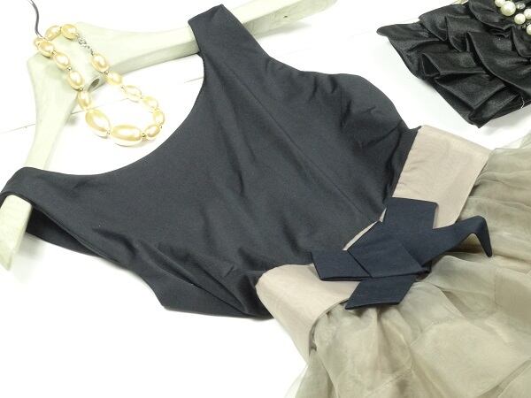 背中Vカットオーガンジーのドレスワンピース。トップスは伸縮性のあるジャージ素材でやさしい着心地。スカート部分はシックなココア色のオーガンジーを重ねてウエストにはアクセントに黒のリボンをあしらっています。背中を大きくV字カットすることにより華やかさを演出。パーティやイベント、結婚式など、様々なシーンで、魅力ある印象を与えてくれる一枚です。背中ファスナ-有。裏地有。ウエストの黒のリボンは取り外し可能。