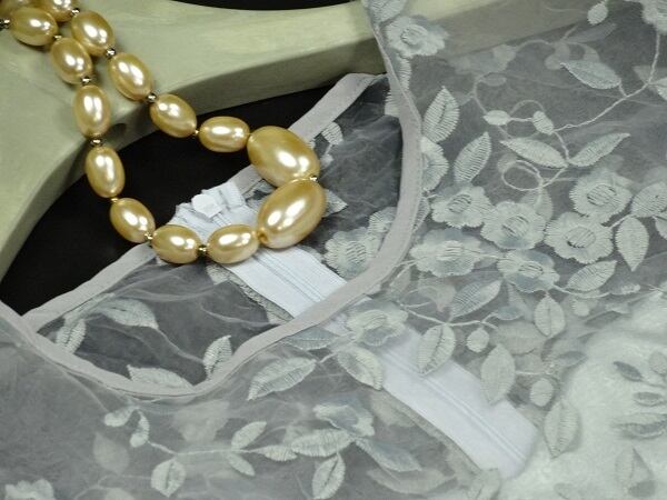 刺繍とシフォンのロングドレス。上半身はオーガンジーに同色で花模様を刺繍し、ウエストから裾にかけてはしなやかなシフォン地をたっぷり使用しゆったりとした印象に仕上げています。背中の方からウエストにかけてのラインも美しく、品の良いテイストを醸し出しています。パーティやライブ、イベント、結婚式など、どんなシーンでも活躍してくれる一着です。背中ファスナー。裏地あり。