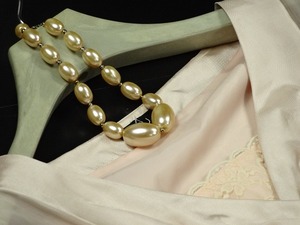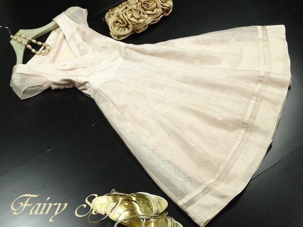 レースとサテンのワンピ-ス。淡いピンクのサテン地に、胸元とスカート上地部分にレースを配した上品な一着。袖もぷっくり可愛いフレンチタイプ。全体的に優しい感じに仕上げられています。裏地あり。左脇下ファスナ-有。