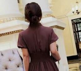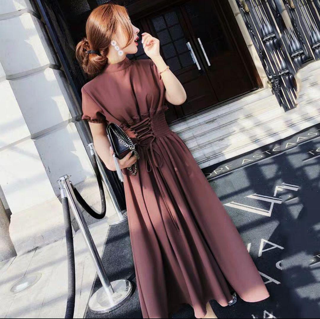 エレガント編紐リボンのワンピース。ウエストはシャーリング仕様に編紐リボンで着幅を調節。立て襟で品の良さを。またふっくらとした袖で可愛らしさを演出した一着です。裏地なし。背中ファスナ-。編紐リボンベルト付き。