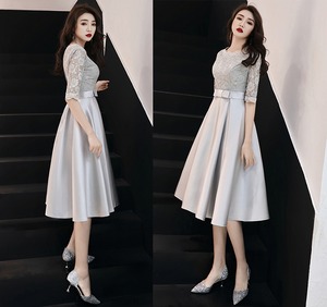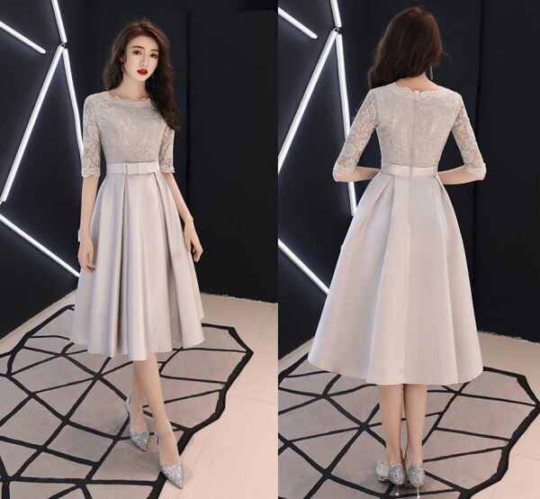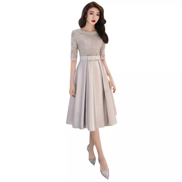 シルバ-の光沢エレガントパ-ティ-ワンピ-スです。気品に満ちたとてもエレガントで上品なひとクラス上をいく一品です。トップス部分のレースの透け感もとても上品でエレガントです。裏地有。背中ファスナ-有。胸パット付き。