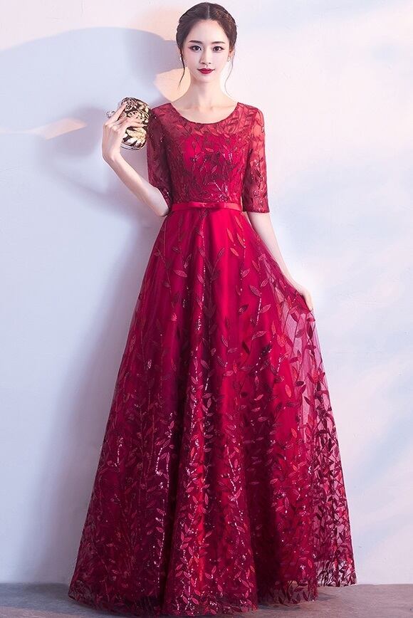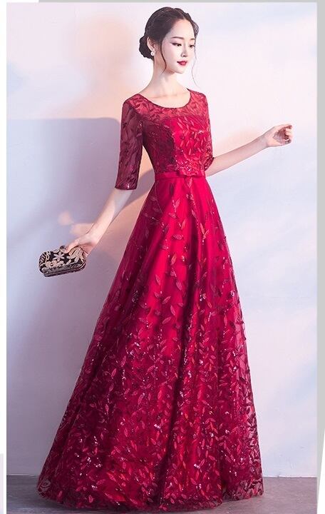 刺繍レースパーティ-ロングドレスです。袖やデコルテの透け感がとても美しく大人の女性を醸し出してくれるエレガントなロングドレスです。全体に赤の刺繍とビジュ-飾りが施されデザイン性のあるスタイルがとても魅力的な一着です。全体的に優しい感じに仕上げられています。背中ファスナ-有。胸パット付き。
