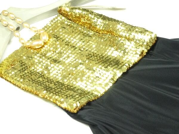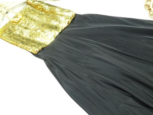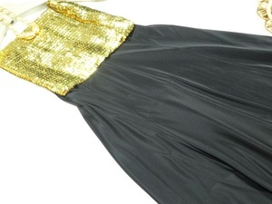 チューブトップとロングスカートのセットアップ。ゴールドのスパンコールをちりばめたチューブトップと、シックな黒のロング丈のスカートのコンビネーションが魅力的。スカートは両脇がゴム仕様になっているので、サイズ的にゆったり着用いただけます。華やかでゴージャスな一着です。スカートは裏地有で、後ろファスナ-有。