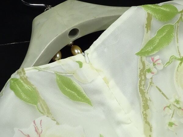 花模様のレース仕立ての膝丈ノ-スリ-ブワンピース。白の下地の上に、花模様をプリントしたレースをかぶせていて、薄い透け感がやわらかな印象を与えてくれています。大きなラウンドネックにノースリーブも全体の中でバランスが良く、ピュアでフェアリーなデザインになっています。煌めく太陽の光の中でも、また新緑の爽やかな風の中でも、着る人を美しく魅せてくれる一着です。裏地有り。背中ファスナー有。