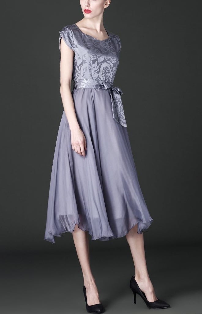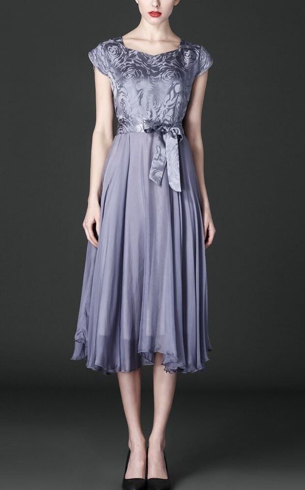 上品花柄フレア-ワンピースです。トップス部分は光沢感があり品の良いセクシー感をかもしだしています。ウエストを共布のベルトリボンでキュッと絞るデザイン。裾は両サイド少し長めになっていてシックでやさしくエレガントな一着です。右サイドファスナー有。裏地有。布ベルト付き。