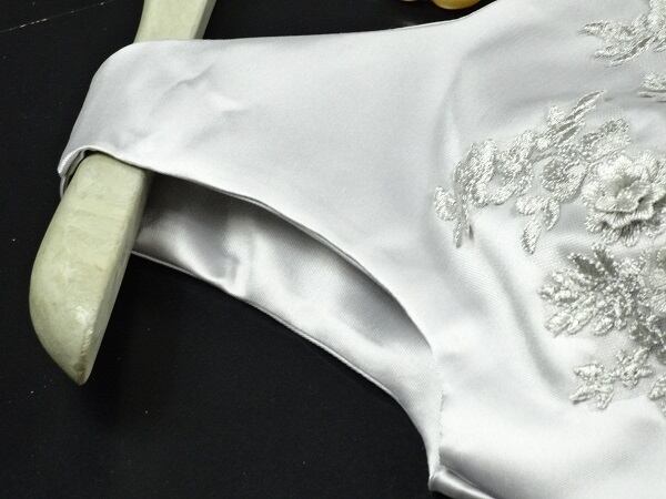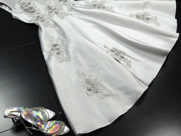 花柄立体刺繍フォーマルミディアムドレスです。トップス部分の立体刺繍がとても美しく豪華で大人の女性を醸し出してくれるエレガントなドレスです。デザイン性のあるスタイルがとても魅力的な一着です。全体的に優しい感じに仕上げられています。裏地有。背中網掛け。背中腰より下ファスナ-有。胸パット付き。