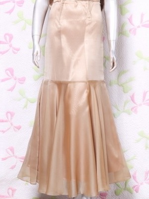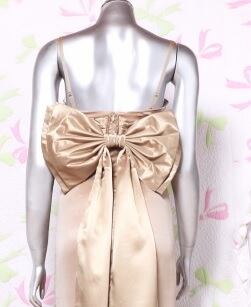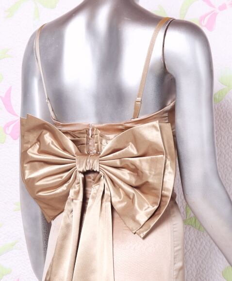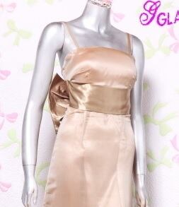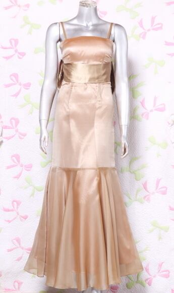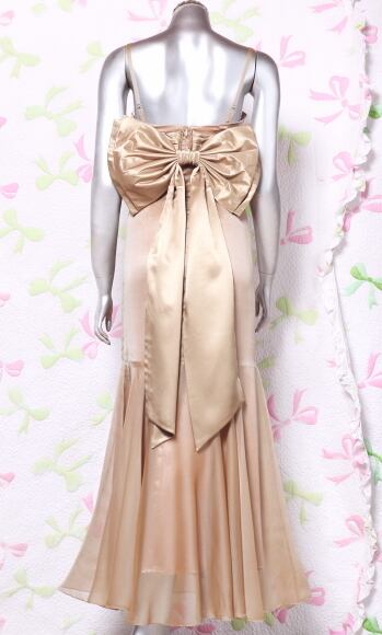 背中リボンのシックなロングドレス。落ち着いたブラウンゴールドのサテン地の上に薄いオーガンジーを重ねた上品なデザイン。ウエストは、前部分に幅広のサテンで切り返し、背中部分は大きなリボンでアクセントに。デザイン性のあるスタイルがとても魅力的な一着です。全体的に優しい感じに仕上げられています。裏地有。背中ファスナ-有。胸パット付き。背中のリボンは取り外し可能。