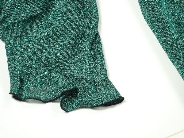 ラメ入りのロング丈ワンピース。ラメの入った伸縮性のある緑の生地をたっぷりと使用した動きやすく着心地の良いでデザイン。胸元と左手首に同素材でこしらえた花のモチーフをあしらいアクセントに。上品でエレガントな一着です。裏地付き。背中ファスナ-有。