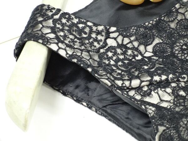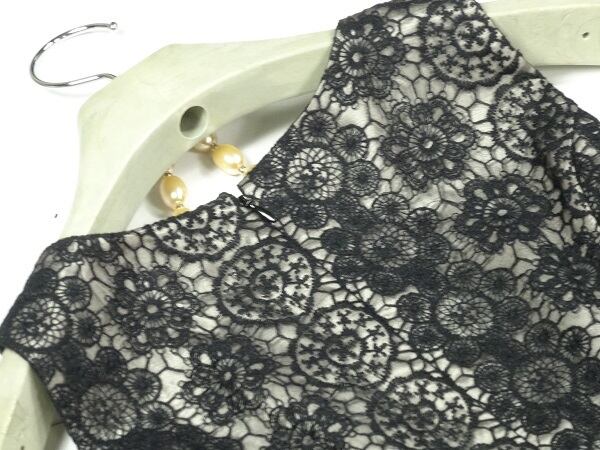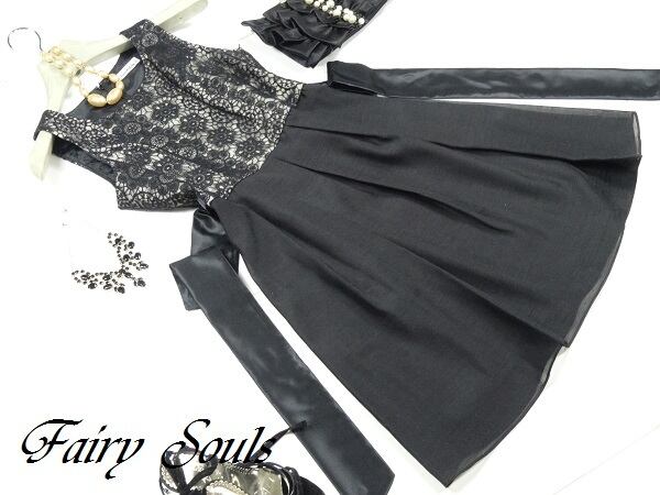 首飾り付レースとシフォンのワンピース。トップス部分はシックなチャコールグレーのサテン地の上にレースを重ね、スカート部分はかろやかな黒のシフォン系生地をたっぷり使用しています。ウエストのサテンのリボンベルトがアクセントに。どんなシーンにも活躍してくれる一着です。背中ファスナー。裏地付き。首飾り付き。