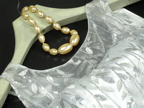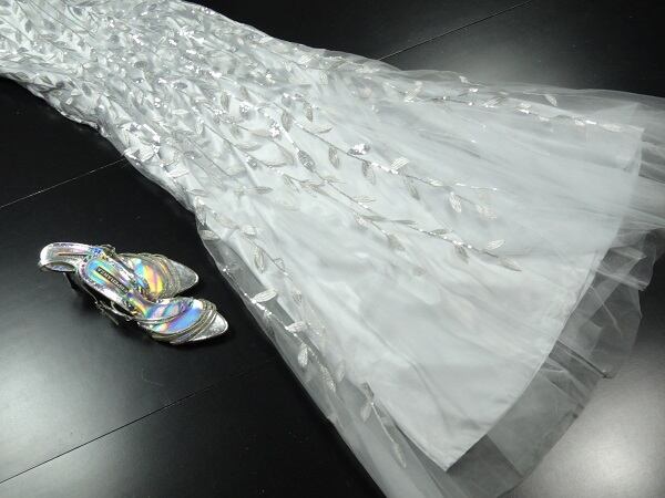 刺繍レ-スとチュールのマーメイドロングドレスです。全体に刺繍とビジュ-を贅沢にあしらい、スカート部分は間にチュールを挟み高級感を醸しだしています。デコルテラインと肩から背中にかけてほんのり肌が透けて見えることで上品なセクシー感を演出。パーティやライブ、イベント、結婚式など、どんなシーンでも活躍してくれる一着です。背中ファスナ-有。裏地なし。胸パット付き。