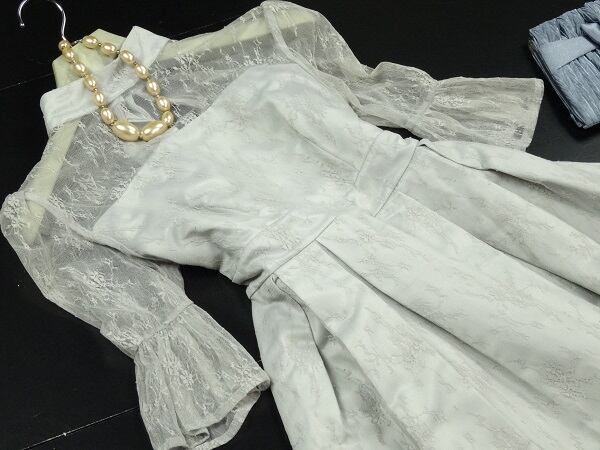 レース袖ハイネックワンピ-スです。全体的に刺繍が施されたレ-スが重ねられとても美しく品のある大人の女性を醸し出してくれるエレガントなワンピ-スです。首後ろはリボン結びでデザイン性のあるスタイルがとても魅力的な一着です。全体的に優しい感じに仕上げられています。裏地有。背中ファスナ-有。