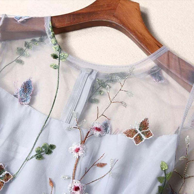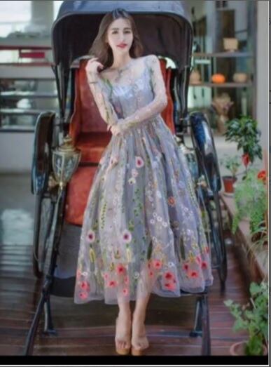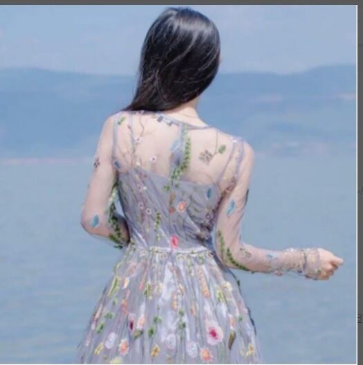 トレンド刺繍花柄チュ-ルマキシ丈ワンピ-スです。トレンド感たっぷり色の美しいエレガントなワンピ-スです。デザイン性のあるスタイルがとても魅力的な一着です。可愛いデザインで全体的に優しい感じに仕上げられています。背中ファスナ-有。裏地有。