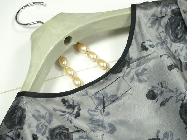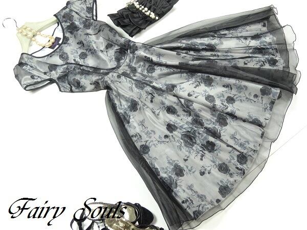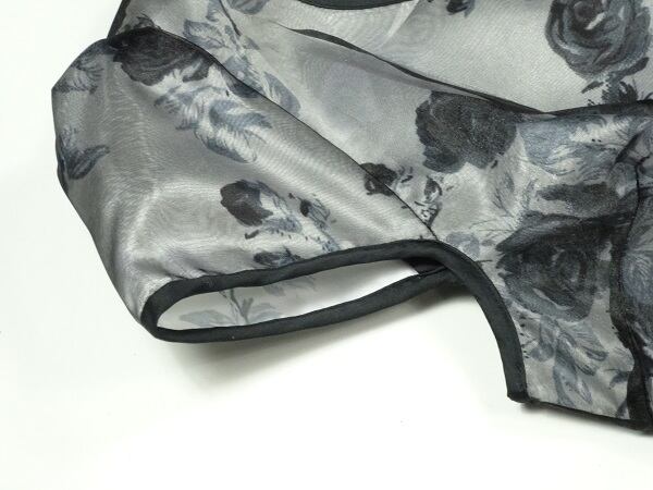贅沢シフォン花柄ワンピ-ス。シルバーグレーのサテン地の上に、シックなモノトーンの花柄をプリントしたオーガンジーを重ねた豪華なデザイン。ふんわりとしたパフスリーブの袖が、シックな中にも可愛らしさをアップしています。ちょっとおしゃれな普段着や、結婚式、コンサートなどフォーマルなシーンにも最適な一着です。左脇ファスナ-。裏地なし(サテン地とオーガンジーの2枚仕立)。