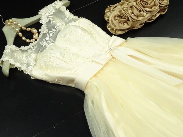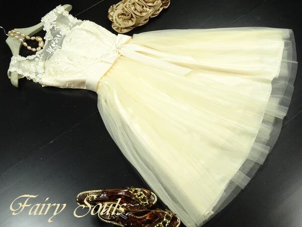 立体刺繍チュールレースのドレス。かわいいクリーム色のチュール地に同色の糸で刺繍をほどこした豪華でフェミニンなデザイン。デコルテラインから肩にかけての透け感が大人の雰囲気を醸し出し、背中の編みリボンの可愛らしさと絶妙なバランスをとっています。シックで上品な女性を表現。パーティやイベント、コンサート、結婚式にと、さまざまシーンで活躍してくれる美しい一着。背中編み紐掛け。腰下ファスナー有。裏地付。胸パット付き。