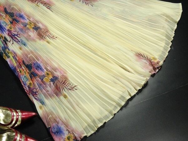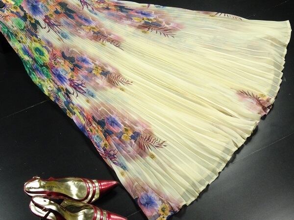 プリントシフォンのプリ-ツスカ-ト。軽いシフォン地にクラシカルな花模様をプリント。ウエストはゴム仕様でサイズにゆとりをもって着用いただけます。ファスナ-なし(ウエストゴム仕様)。裏地あり。