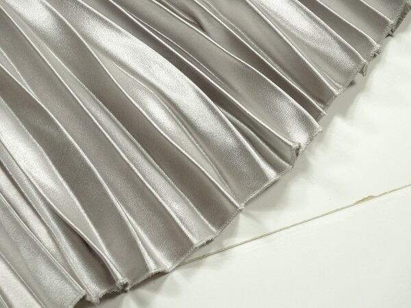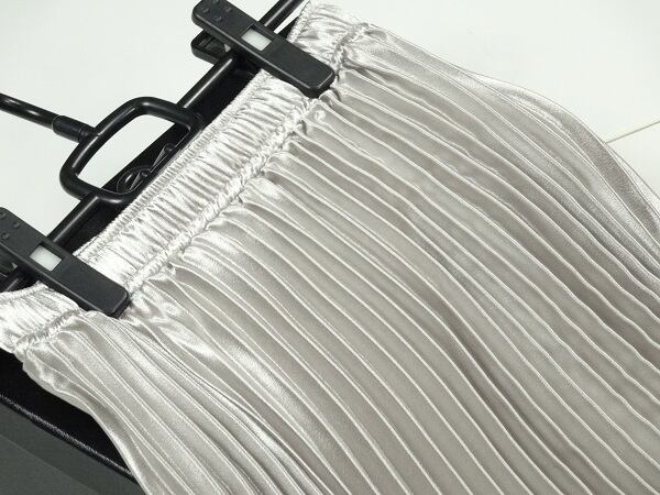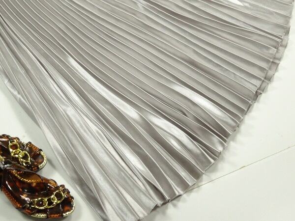 光沢メタリックシルバ-ロングプリ-ツスカ-トです。しわになりにくく動くたびに揺れるエレガントなプリ-ツスカ-トです。ファスナ-なし(ウエストゴム仕様)。裏地なし。