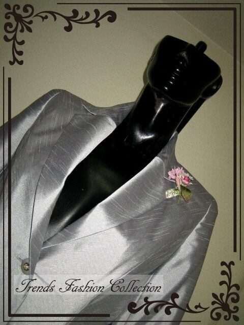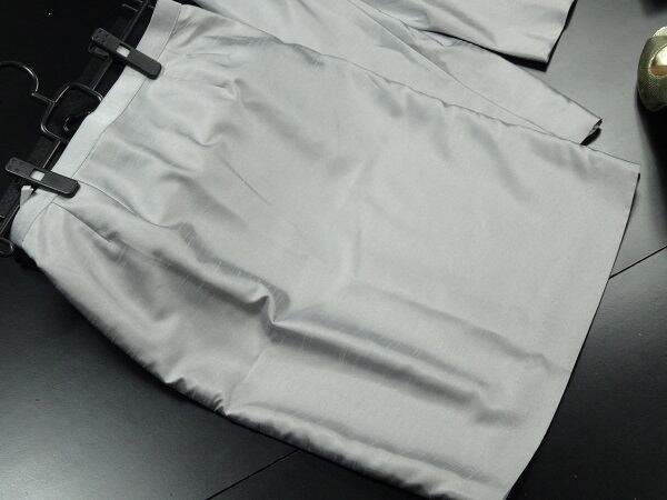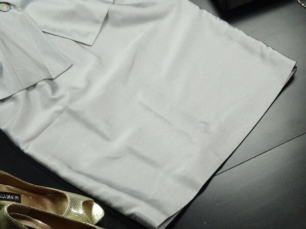 艶のあるシルバーグレ-のスカートとジャケットのセット。ジャケットは一つボタン留め。スカートは後ろ側中央に、裾からウエストにかけて約11cmのスリットが入っている大人の女性を表現してくれるデザインになっています。薄手の軽い生地なので、長時間着用していても疲れないため、フォーマルなシーンに最適な一着です。 裏地有り。スカートは後ろファスナーあり。